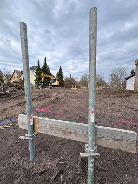 Der Vermesser war vor Ort und das Schnurgerüst steht – damit ist alles vorbereitet und wir können nun mit den Erdarbeiten für die Bodenplatte beginnen.